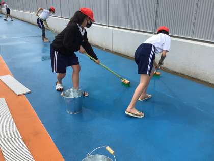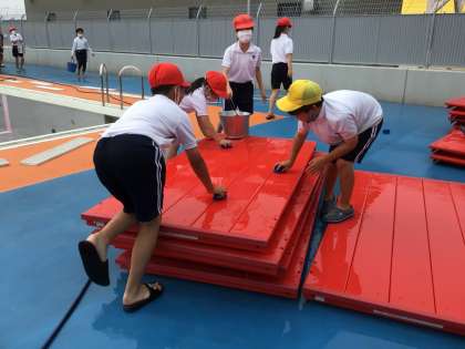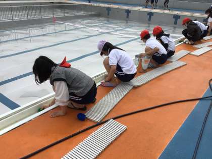 昨日に続き、今日は5年生がプールの器具庫や更衣室、プールサイドなどを掃除しました。
