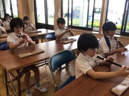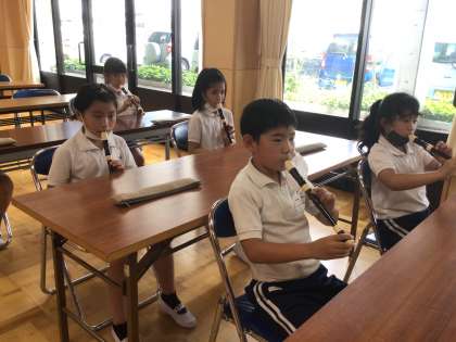 息づかいをシャボン玉を吹くときに例え、「勢いよく飛ばす」「小さいシャボン玉を作る」など想像しながら吹き、息の使い方によってリコーダーの音色が変わることを実感した子どもたち。