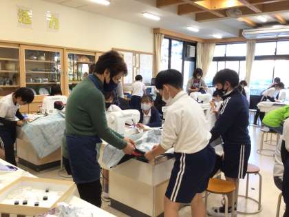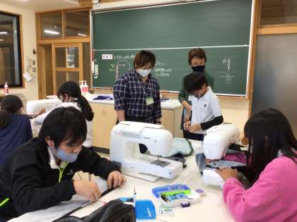 今週は、5年生3クラスの家庭科の授業で、ミシンボランティアのみなさまに子どもたちの補助をしていただきました。