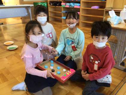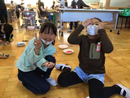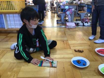 1年生が生活科の学習で拾ってきた木の実などを使って物作りをしていました。