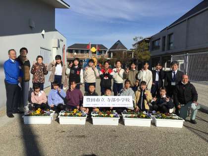 6年生の有志16名の子たちが寺部小学校の代表として式典に参加し、パンジーを植えました。