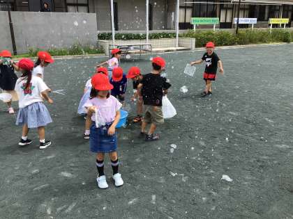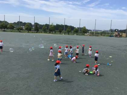 どんな道具を使ったらしゃぼん玉ができそうかを考え、いろいろな道具を使ってしゃぼん玉を飛ばしました。細かいしゃぼん玉や大きなしゃぼん玉を飛ばして、楽しく活動しました。