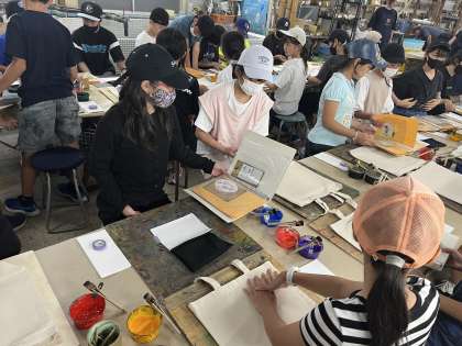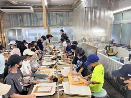 友禅染体験を行います。真剣に話を聞き、自分の好きなデザインを選んでいます。