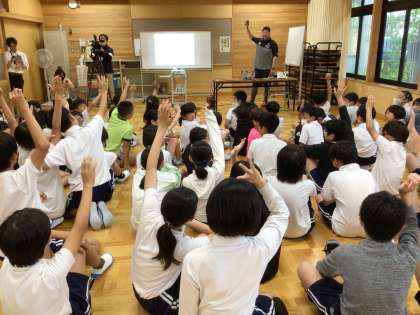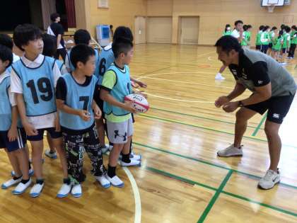 元ラグビー日本代表の選手が4名来校し、6年生にラグビーのルールや楽しさを教えてくれました。