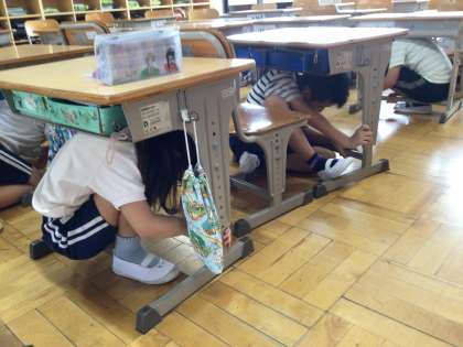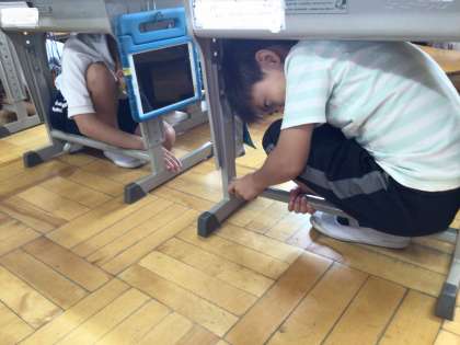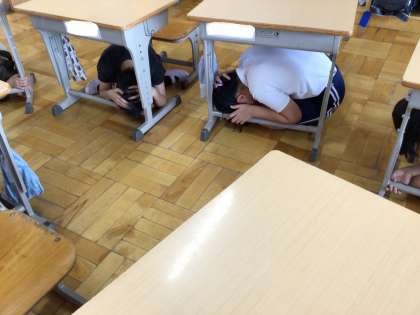 9月2日 避難訓練(シェイクアウト訓練) 公開日 2024/09/02 更新日 2024/09/02 学校行事 朝の学びタイムを使って避難訓練をしました。 写真は、地震が起きたことを想定して、シェイクアウトの姿勢をとる練習をしているところです。 「家庭でも、非常用持ち出し袋や非常食、水などを用意しているよ」と話してくれました。
