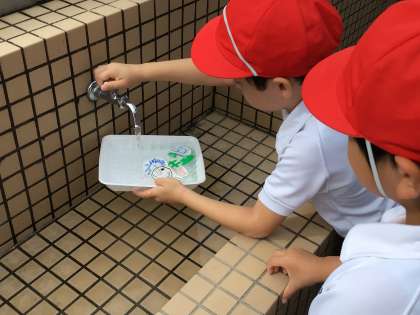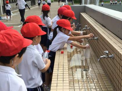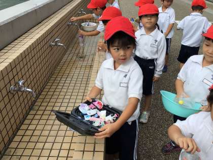 9月27日 1年水あそび その1 公開日 2024/09/27 更新日 2024/09/27 各学年から 1時間目に、1年生が自作の道具を使って水遊びをしました。 ポンプのついた水鉄砲や、魚釣り、射的など、力作が並んでいます。 運動場の砂の上に星や丸などの好きな絵を描いている子もいて、歓声が響きわたっていました。
