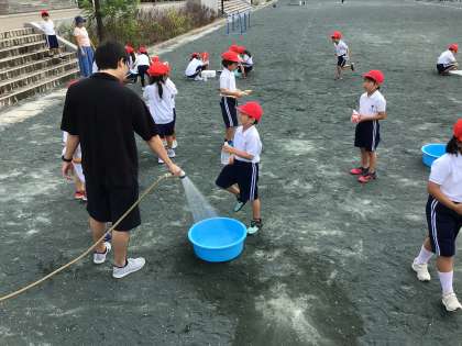 1時間目に、1年生が自作の道具を使って水遊びをしました。