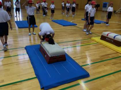 10月4日 4年体育とび箱 公開日 2024/10/08 更新日 2024/10/08 各学年から 4年生の体育の授業では、とび箱を行っています。 この日は台上前転の練習をはじめて行いました。 まずは、マットの上でまっすぐに前転してコツをつかみ、次にとび箱の1段に挑戦しました。頭をつく位置や勢いよく回転することなど、慣れるまではもう少し時間が必要のようです。