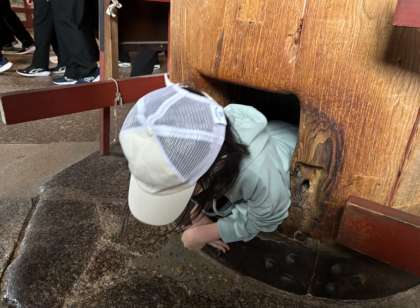 鼻の穴と同じ大きさだという、柱の穴を通り抜けるチャレンジは成功しました。