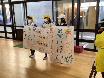 朝は生活委員が、げた箱のところに立ってあいさつ運動をしていますが、その元気なあいさつが響きあう様子を撮影してもらいました。