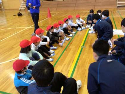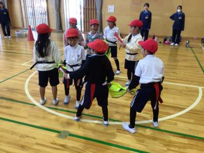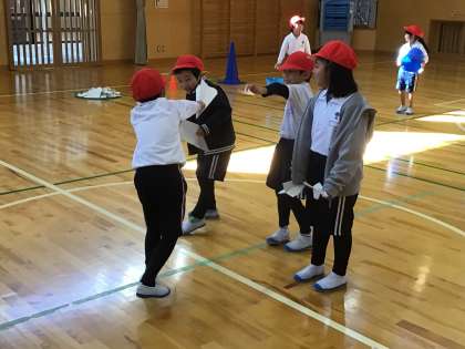 中学3年生の生徒たちが考えたオリジナルのスポーツである「タグだるま」「ことだま遊び」「シューティングペーパー」を楽しみました。