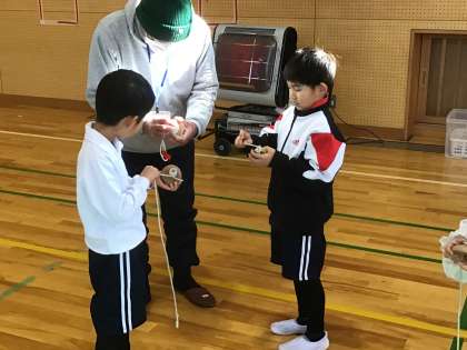 地区のお年寄りにゲストティーチャーとして寺部小に来てもらい、1年生が昔の遊びについて教えてもらいました。初めて遊ぶものばかりで、少し難しかったようです。