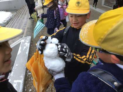 しばらくすると、児童は雪玉を抱えながら元気よく登校してきました。