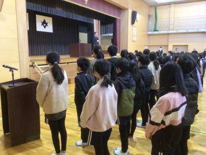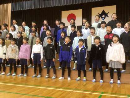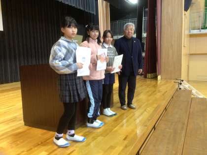 1月16日 児童集会 公開日 2025/01/16 更新日 2025/01/16 お知らせ 学びタイムに児童集会を行いました。 はじめに寺部地区のマスコットキャラクター募集で最優秀賞、優秀賞をとった4年栗田さん、5年山内さん、3年荷川取さんの表彰がありました。 さらに、5年生は「調べる学習コンクール」の学年賞をもらったので、その報告をしてもらいました。 その後、3年生と4年生はみんなの前で合唱の披露をしました。とてもじょうずでした。