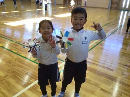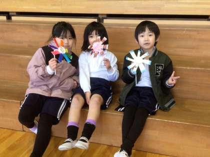 1月21日 1年図工 かざぐるま 公開日 2025/01/21 更新日 2025/01/21 各学年から 1年生は、自分で作ったかざぐるまを使って思いっきり遊びました。 体育館中を走り回って、回転のしかたを観察します。 はねにつけた色とりどりの模様が、回転するとさらにきれいに見えます。 気に入った様子で、昼放課も中庭に出てかざぐるまで遊んでいました。