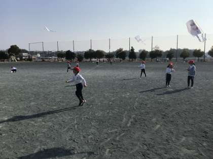 1月23日 生活科たこあげ 公開日 2025/01/23 更新日 2025/01/23 各学年から 1年生が凧あげをしました。 自分で作った凧をうれしそうに見せてくれる子、少しでも高くあげたくて全力疾走する子などにぎやかです。 補助で持ってあげた友達の凧が、手元から浮かび上がる瞬間には歓声が上がっていました。