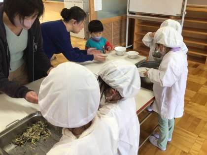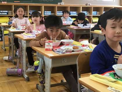 「いただきます」をした後、うどんを口いっぱいにほおばり、「おいしい」という子どもたちの笑顔がたくさん見られました。