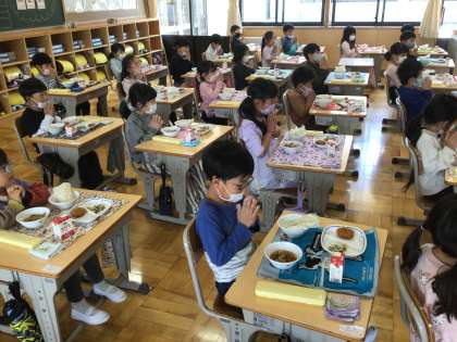 1年生の給食が始まりました。今日の給食メニューは、肉うどん、いかカツ、ひじきサラダ、牛乳です。