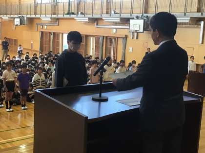 全校集会を行い、前期の学級委員と委員長・副委員長の任命を校長先生に行ってもらいました。