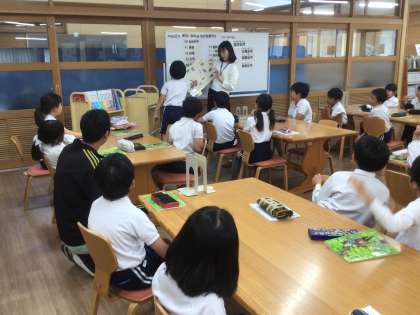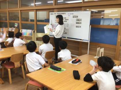 図書館司書の石川先生に図書館の利用についてお話を聞きました。 写真は、4年2組の様子です。