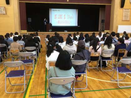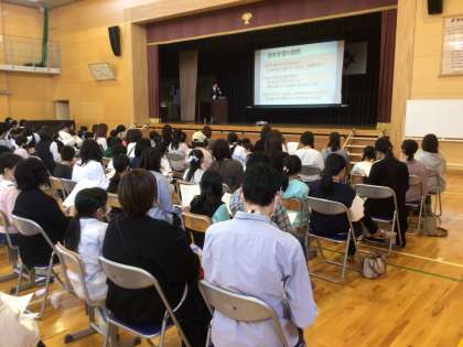 外遊びの様子と、5年生の野外学習の説明会の様子です。