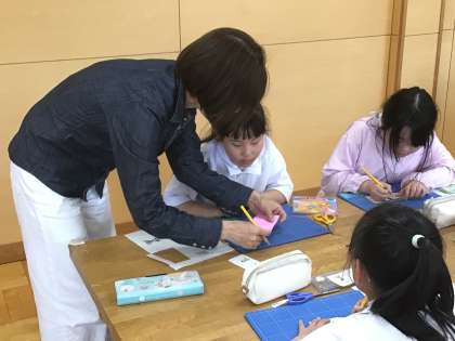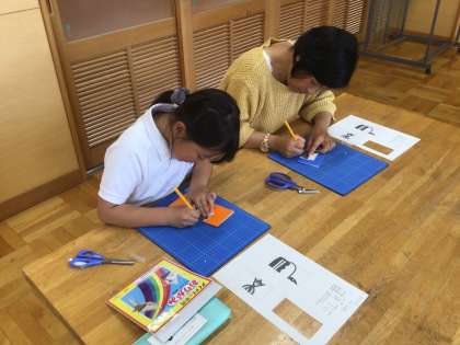 消しゴムハンコクラブは、講師の先生をお呼びして活動しています。彫刻刀を使ってゴム製のハンコ板を削っていく予定です。まずはクラフトカッターを使って折り紙を切る練習をしました。半分に折った折り紙を切ると、左右対称のデザインのものができ上がりました。みんな真剣です。