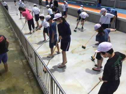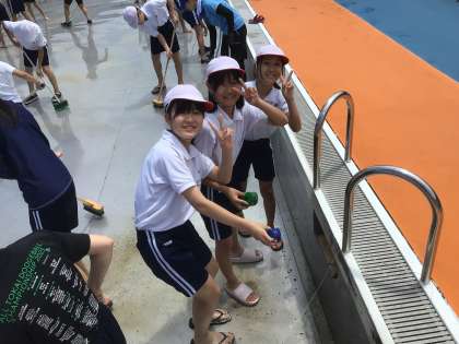 強い日差しのもと、6年生がプールの掃除をしました。