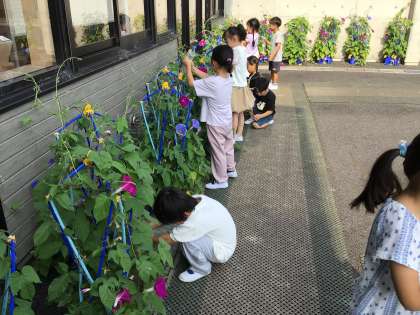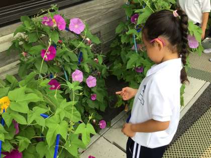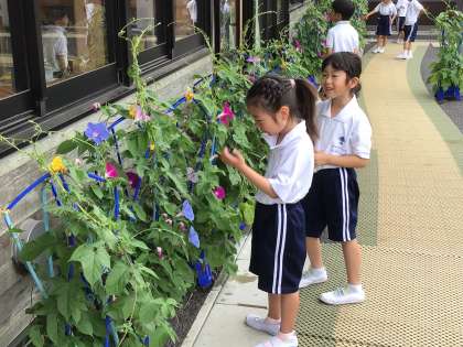 中庭には、1年生がお世話をしているアサガオが次々と咲いていて、とてもきれいです。