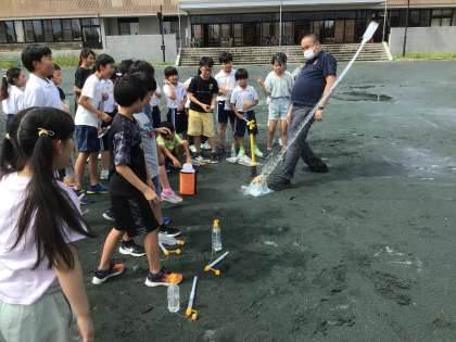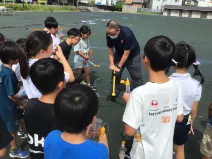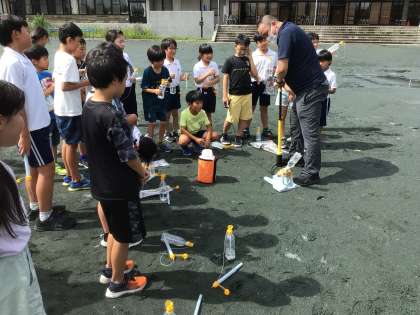 5年生が、理科の授業でペットボトルのロケットを飛ばす実験をしていました。
