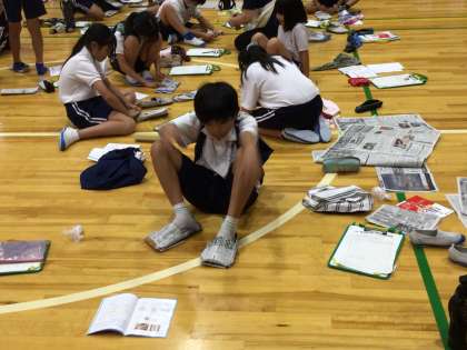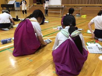 9月25日 5年防災講座 公開日 2025/09/25 更新日 2025/09/25 各学年から 5年生は総合で防災について学んでいます。今回は、社会福祉協会の方々を講師としてお招きして、災害が起こったときにどうすればいいのか学びました。けがをした人を見たら、ビニール袋を手にはめて患部をおさえて止血することや、風呂敷を使って簡易的なリュックサックを作る方法、新聞紙でスリッパを作る方法などを学びました。
