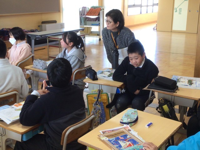 5,6年生の英語の授業の補助として、ボランティアの白鳥さんに入ってもらっています。
