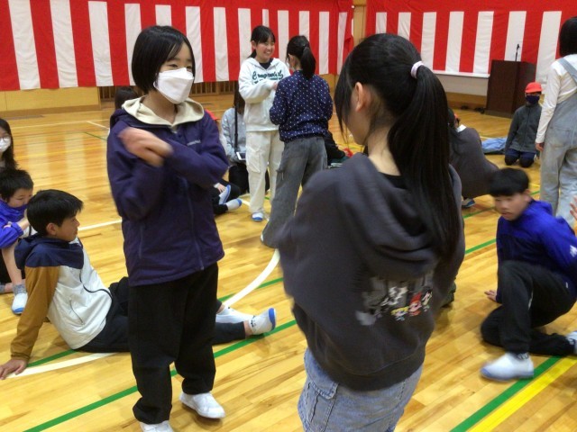 5年生と6年生でチームを組み、力を合わせて「ジェスチャー伝言ゲーム」と