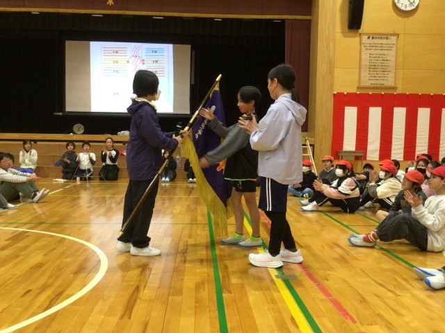 最後に、6年生代表から5年生に校旗を渡す引継ぎ式が行われました。