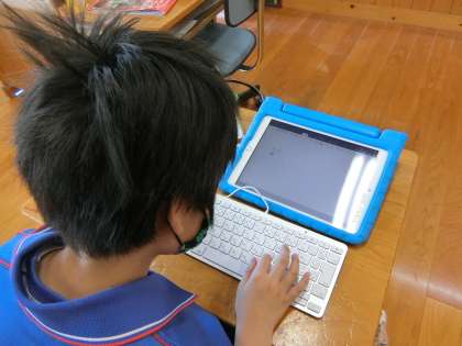 朝の学習タイム、ともえ学級ではタブレットでローマ字入力の練習をしていました。「あいうえお」から順に入力していくことをがんばって練習していました。「担任の先生の名前を書いてみようよ」と声をかけて一緒に練習しました。上手に入力できました。