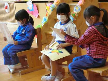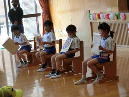 4年生からはひとりひとりへのプレゼントです。手作りのキーホルダーと、割りばしで作ったゴム鉄砲の的当てゲームが封筒に入っています。代表の子が、ゴム鉄砲の使い方や遊び方を実演してくれました。封筒にはひとりひとりの名前や可愛らしいイラストが描いてあります。1年生は嬉しそうです。