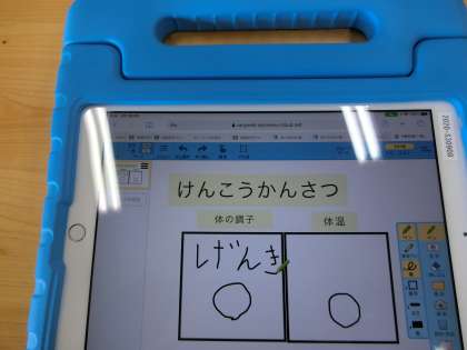 3年生の朝の会の様子です。席に着いた子どもたちに、まず手を洗って清潔にすることを指示しました。次に、充電保管庫からタブレットをl出してきてTeamsの会議に参加するように指示し、全員の参加を確認しました。全員の顔が確認できて担任の先生が話をし、健康観察を行うために「Teamsからスカイメニューに切り替えてログインするように」と指示しました。子どもたちは指示に従って画面を開いて「〇」「げんきです」などと書き込みました。