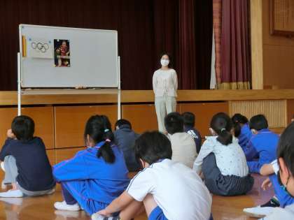 今日のお話は卓球のお話です。卓球の伊藤美誠(みま)選手が、オリンピックが延期になったことを受けてインタビューで語った言葉に感銘を受けたそうです。「この1年がプラスになるから、やり抜こうと自粛期間中に思った」という伊藤選手の言葉を紹介し、子どもたちに「コロナでいろんなことが変更になったり運動会が延期になったりしているけれど、今、目の前にあることを一生懸命にやって、これがプラスになるように頑張っていきましょう」と語りかけました。