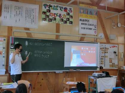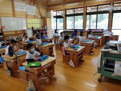 先生がスクリーンに画面を映しながら黒板にマイクの絵を書いて、子どもたちへの約束事を指導していました。「自分が話すときはマイクをオン、聞くときはマイクをオフだよ」。低学年には絵で示すのが分かりやすいですね。スムーズにできるように毎日コツコツがんばっています。