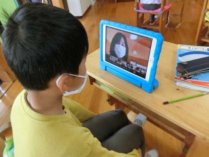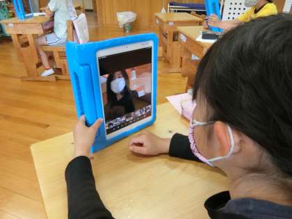 今朝の3年生の朝の会のスピーチのテーマは「昨日の夜のこと」です。「私は○○をしました。校長先生はどうですか」と子どもに指名されたので、私はタブレットを持って移動し、離れたところでリモートスピーチをしました。
