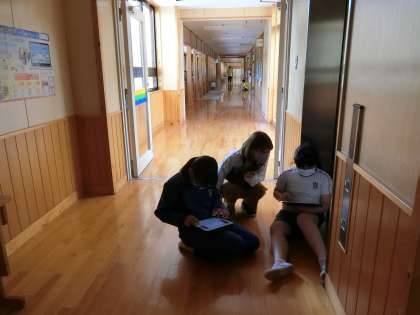 朝の校内の様子です。放課ではありません。いろいろな学年の子がタブレットを手にしていろいろな場所を歩いていました。それぞれリモート朝の会を行っていたり、先生から出された課題に取り組んでいたりします。