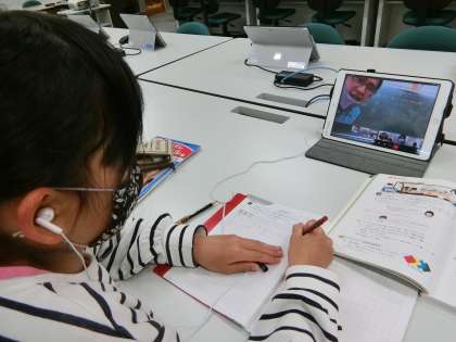 授業をしている先生の様子はこんな感じで、別の部屋で授業を受けている子どもの様子はこんな感じです(写真参照)。子どもたちは音声が聞き取りやすいようにイヤホンをしています。先生は黒板を使っていつものように授業をし、子どもたちはノートと教科書を手元に置いていつものように授業を受けています。