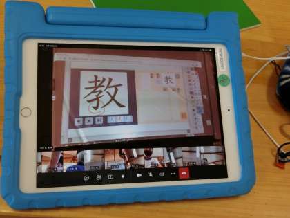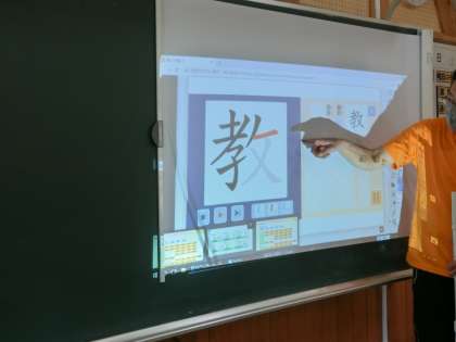 4、先生の説明を聞きながら子どもたちは自分のタブレット上で漢字の書き順を確認しながら指書きする。