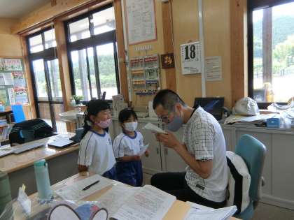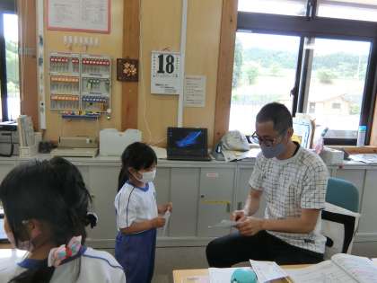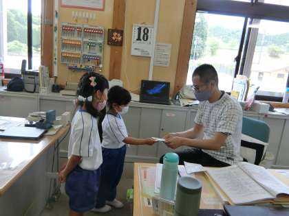 2時間目のあとの放課に、1年生が職員室にやってきました。絵と名前を書いた名刺を先生に渡して「1年生の○○です。よろしくお願いします」と自己紹介です。先生は名刺をもらってニコニコ。名刺の名前や絵について子どもたちに質問したりして和やかに会話をしていました。かわいらしい名刺、一生懸命に作ったんですね。