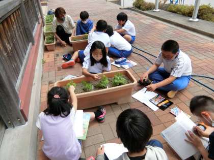 3時間目、4年生が職員室前でプランターを囲んでゴーヤの観察をしています。ノートと色鉛筆で絵を描きます。定規を当ててどれだけ伸びたか測ります。