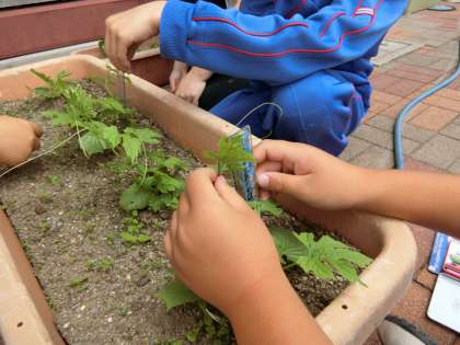 「葉っぱがなんだかくさい。ゴーヤのにおいがする」と感想を言っている子がいました。それも大切な発見ですね。私も指先で葉をこすって匂いをかいでみました。ゴーヤは苗の時からゴーヤの匂いがすることを、子どものつぶやきから教えてもらいました。ひとつ発見です。