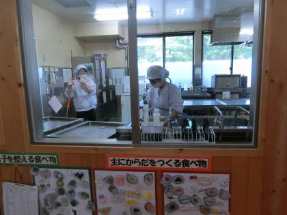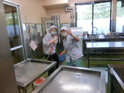 いつもおいしい給食をありがとうございます。今日の唐揚げも野菜の和え物もおいしかったです。ごちそうさまでした。給食が終わった後、公務手さんが配膳室の拭き掃除をしてみえました。