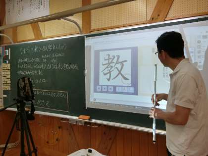 先生が次に出した指示は「では、今の漢字を、漢字ドリルの〇ページに練習しましょう」です。遠い教室にいる子どもたちにも、指示や黒板の様子が鮮明に分かります。子どもたちはすぐに漢字ドリルを開いて鉛筆で字を書き始めました。