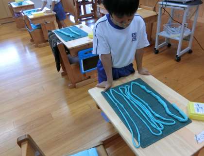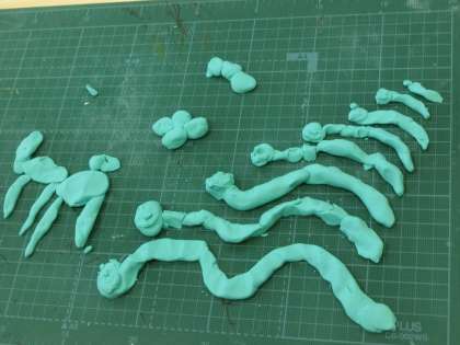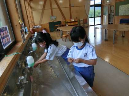 ねんど&タブレット(1年生) 公開日 2021/05/19 更新日 2021/05/19 校長室から 5時間目の1年教室です。図工です。今日は初めての粘土です。単元は「ねんどとなかよし〜どうぶつをつくろう」です。粘土板に四角い粘土を打ちつけて柔らかくして、自分の好きな動物を作りました。うさぎ、へび、こぶら。いろんな動物ができました。 粘土で脂っぽくなった手を、石鹸でしっかり洗うようにと先生が言いました。子どもたちは手を洗いに行きました。手を洗った後に、まだ活動の続きがあるみたいです。