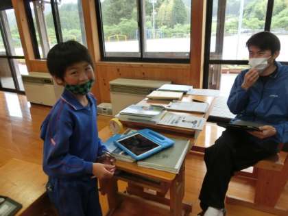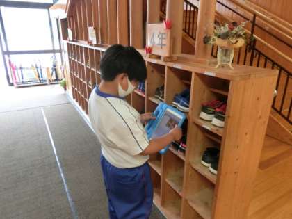 4時間目、ともえ学級の二人がタブレットで写真を撮っていました。自分の好きな写真を撮る→発表ノートに貼るという練習です。このことができれば、タブレットを持ち帰った時に写真を撮って何か宿題ができますね。学校でログインしたりログオフしたりする操作も繰り返し練習して持ち帰ります。