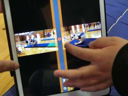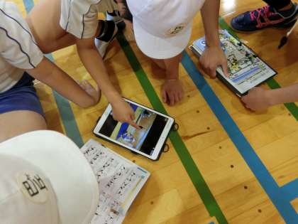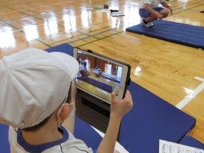 これは昨日午後の5,6年生の体育の様子です。3人一組でマット運動をしていました。それぞれのグループにはタブレットがあり、マット運動の様子を交代で撮影し、教科書と照らし合わせながら、どこが良くてどこを直したらよいか、子どもたちが確認していました。